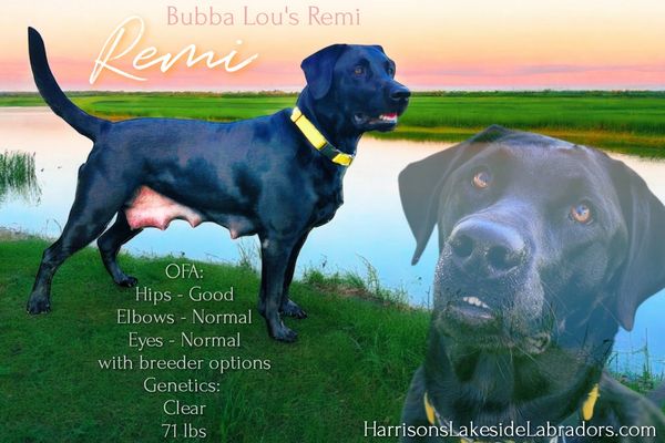 Remi is the queen of our Guardian Program as our first of the program and enjoys her cozy life in Largo, FL with her fun, active family. She is a black (field/American-style) AKC registered labrador from a litter of 12 and weighs approximately 65 lbs. She has a sweet, loveable demeanor and loves to run and play. She has blessed us with 3 litters with all perfectly healthy black, yellow and chocolate furbabies. She has an excellent high drive with a perfect off switch and has produced numerous working line dogs to include SD, HRDD and therapy dogs. Her next litter, expected in the fall 2026, will officially be her last so she can enjoy her retirement with her family.