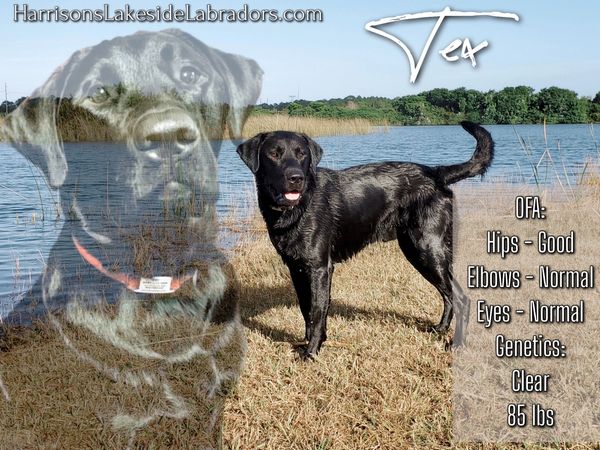 Tex is an 85lb AKC/UKC registered American-style Labrador Retriever born in Paris, Texas. He is pure muscle and snuggles! Tex has never disappointed! He is phenomenal with our children yet is also protective of our family. He will greet you with kisses upon approval and loves with all his heart! Tex swims and runs the field all day and will retrieve anything you throw. He comes from an impressive line of EOD, SAR and hunting dogs and has produced several proven hunting, ESA, SD, SAR and firearms detection dogs.